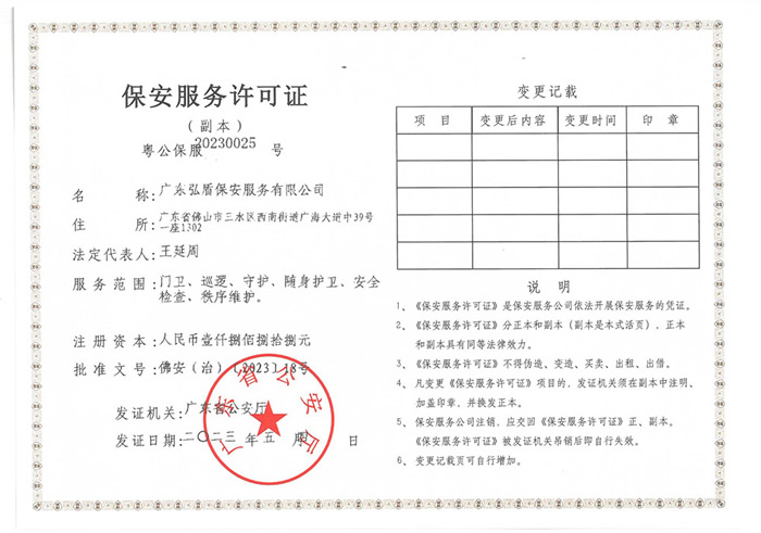 廣東弘盾保安服務(wù)有限公司東莞分公司是經(jīng)東莞市公安局嚴(yán)格審核,廣東省公安廳批準(zhǔn)頒發(fā)《保安服務(wù)許可證》,在東莞市工商行政管理機(jī)關(guān)登記注冊(cè)的,依法開展門衛(wèi)、巡邏守護(hù)、秩序維護(hù)、隨身護(hù)衛(wèi),安全檢查等綜合安保服務(wù)的專業(yè)保安服務(wù)公司... [詳細(xì)介紹]